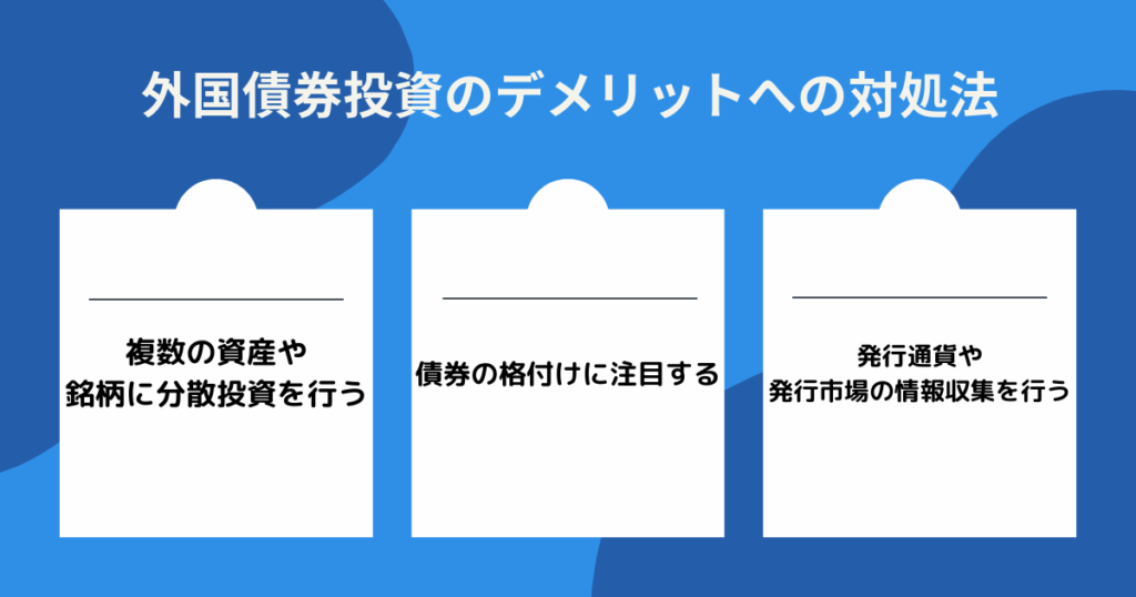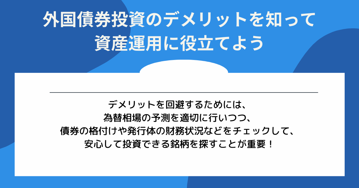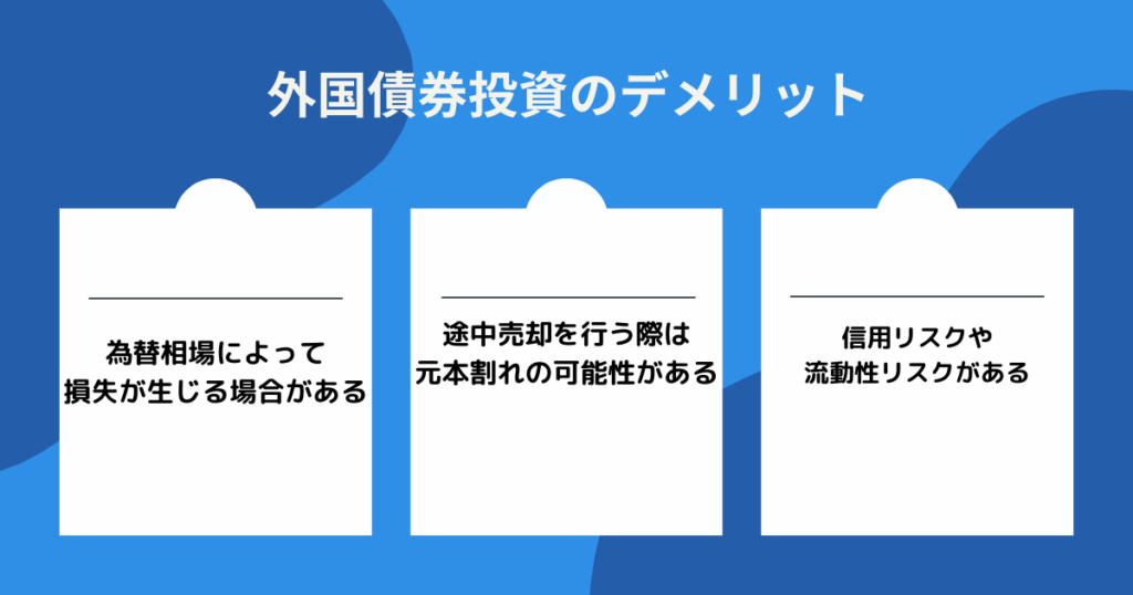 外国債券への投資には、為替の変動で損失が出る可能性に加え、信用リスクや流動性リスクといったデメリットがある。