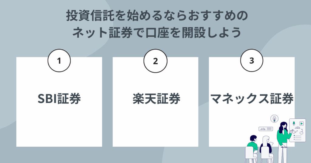 投資信託を購入するには、金融機関で証券口座を開設する必要がある。ここからは、投資信託におすすめのネット証券を3社紹介していこう。