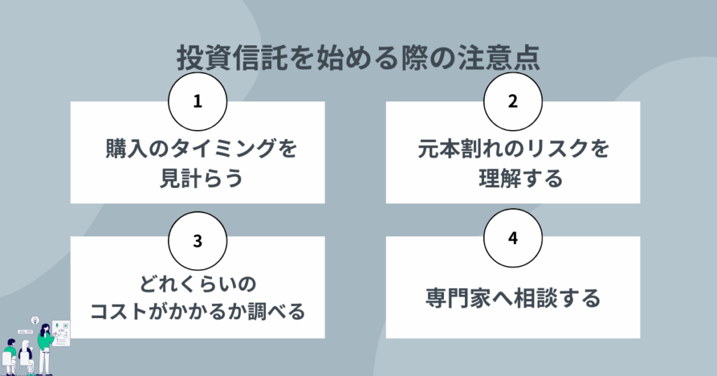 投資信託で運用を始める際は、下記のような点に注意したい。