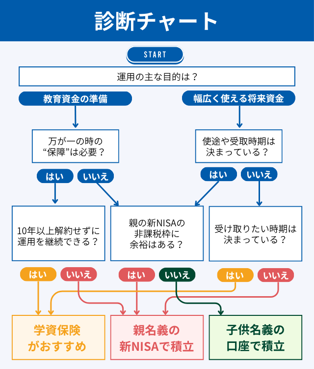 お子さんの資金準備をどの方法で進めるか迷ったときは、以下のチャートで判断してみましょう。