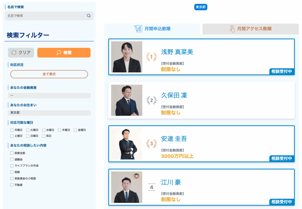 各アドバイザーの経歴や保有資格、得意分野などはプロフィールページで確認できるため、事前に確認した上で誰に相談するかを決められるというメリットがある。