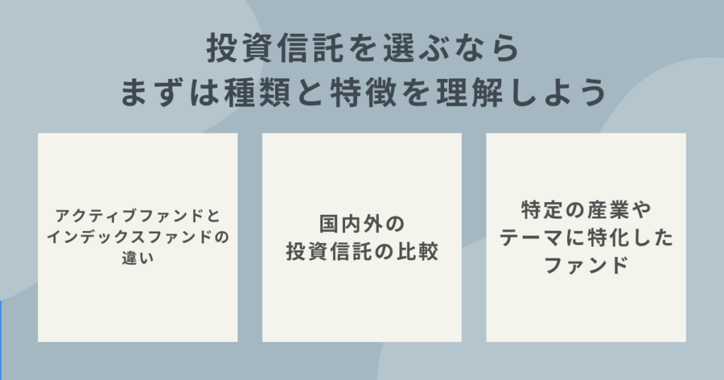そこでまずは、投資信託の種類と特徴について以下3つを解説する。